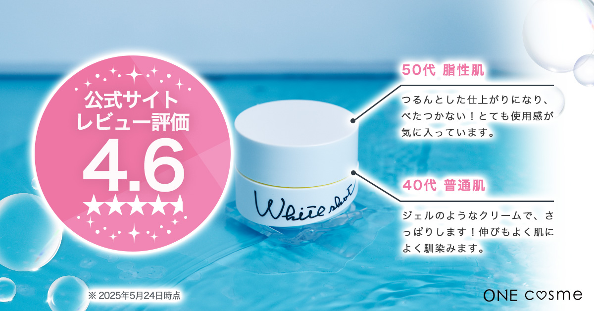ホワイトショット RXSは、夏にぴったりなジェルクリーム。水に浮くほどの軽いタッチで、夏の暑い日でもベトつくことがありません。ひんやりとした付け心地で、みずみずしさがあふれ出るような、スプラッシュショット感触が特徴的です。