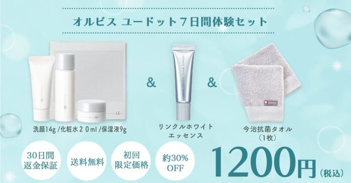 オルビスユー ドットの洗顔料・化粧水・保湿クリーム7日間分と、ヘアミルク サンプルパウチ3包、オリジナル吸水アームバンド、オフクリームサンプル2包が入ったお得なモニターセットはONEcosmeから購入した方限定なので、要チェックです!