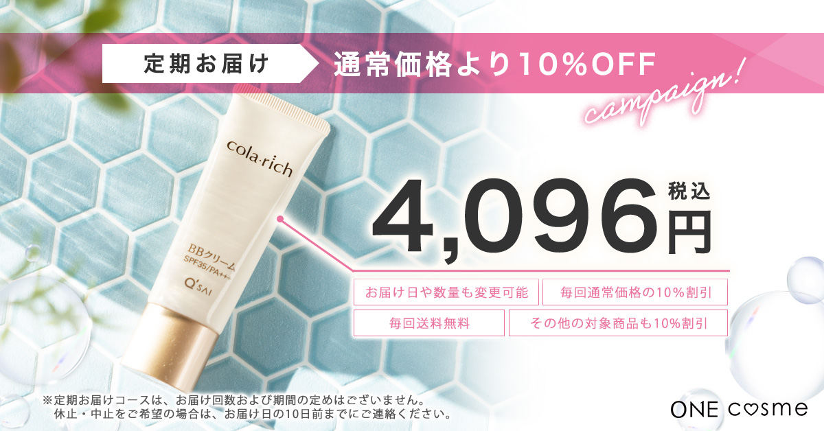 BBクリームシリーズを初めて購入の方に限り、たっぷり2ヵ月分が定期初回限定52%OFF。通常価格4,138円(税込)のアイテムが限定価格の1,970円(税込)で購入できます。 さらに、キューサイの定期お届けコースは便利な5つの特典があるのが魅力。毎回通常価格から10%OFF、コラリッチ BBクリーム以外の対象商品も通常価格より10%OFF、お届け日の変更可能、都合にあわせて休みOK、毎回送料無料と嬉しいポイントだらけです。コラリッチ BBクリームシリーズを使い続いている方の約79%*が定期コースを利用しています。 *2017年2月時点 コラリッチ BBクリームシリーズ 自社調べ