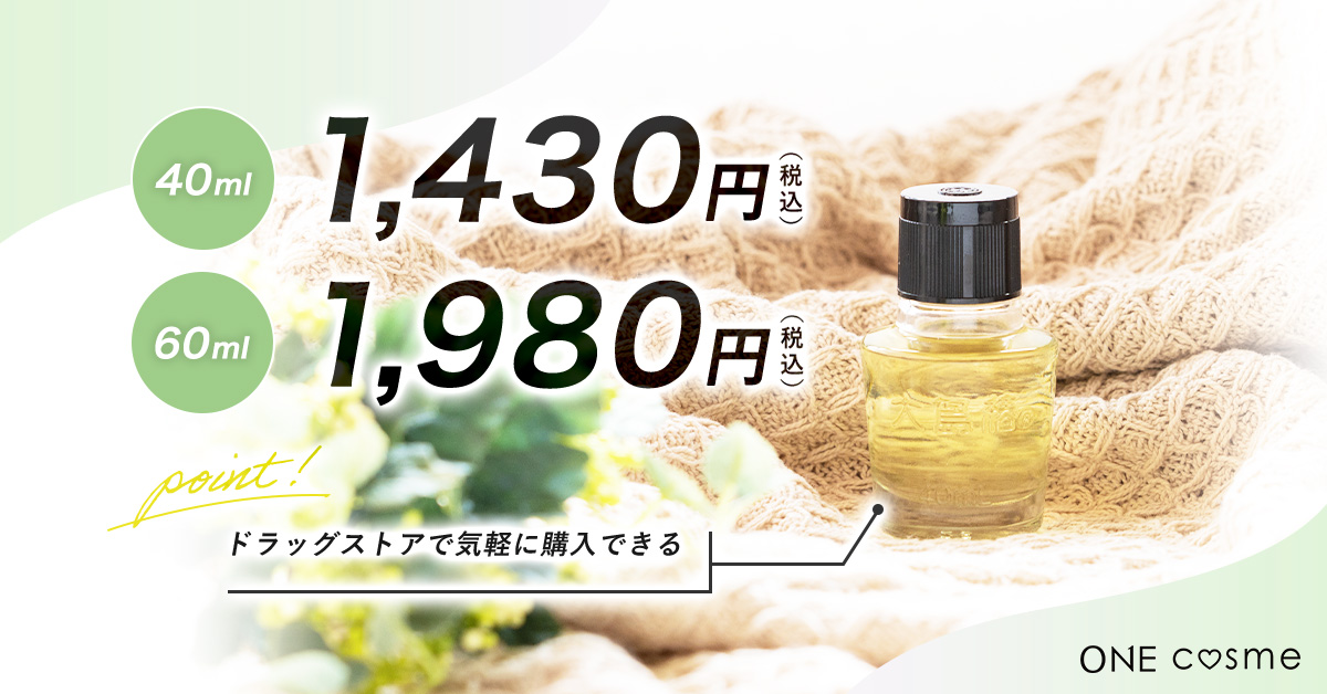 価格は40ml1,210円(税込)、60ml1,650円(税込)、120ml2,530円(税込)となっています。120mlは通販専売品です。プチプラ価格で気軽にドラッグストアで手に入るのが嬉しいポイントです。また独自の精製技術で酸化しにくく、最後まで使い切れるうえに、肌や頭皮にも使えるので乾燥が気になる方には、ぜひ使っていただきたいアイテムです。