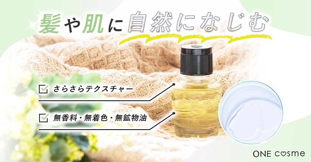 大島椿ヘアオイルは、高い基準をクリアした椿オイルのみを使用しており、刺激が少ないのが特徴です。「オレイン酸トリグリセド」という人の皮脂にも含まれる成分を配合しているので、オイル特有のベタつきやにおいがありません。