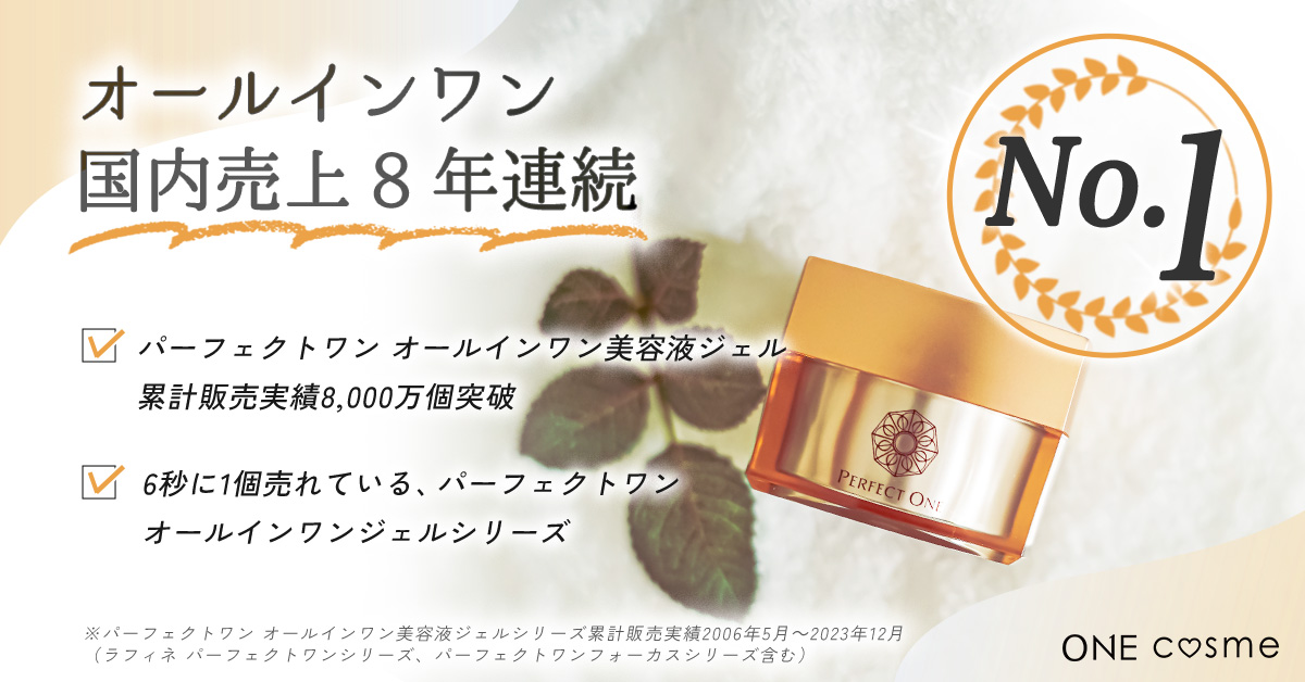 オールインワンスキンケア商品の累計売上販売数が7,000万個を突破し、6年連続オールインワンの売り上げ日本一に輝いたパーフェクトワンから販売中の商品です。5秒に1個のペースで売れている医薬部外品の改善オールインワンジェルで、楽天市場のオールインワン化粧品ランキング第1位、美容雑誌「VOCE」のコスメランキング2022オールインワン部門で第1位にノミネートされました。