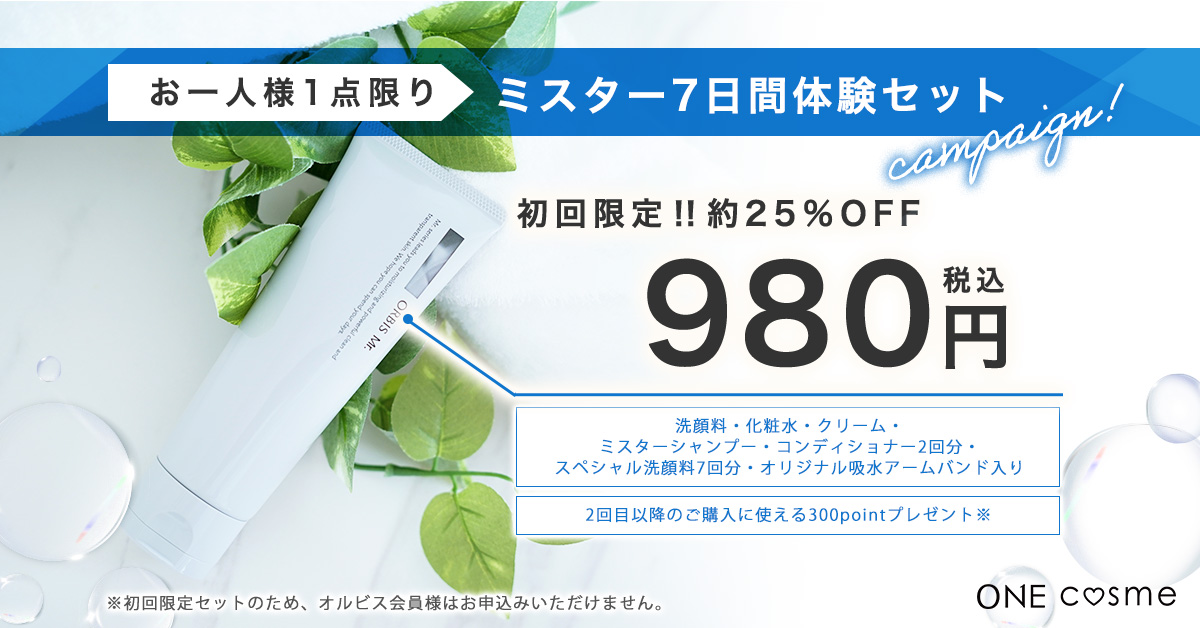 通常価格は120g入って1,650円(税込)。初めての方におすすめなのは、リニューアルを記念して発売される「ミスター7日間体感セット」です。ミスターフォーミングウォッシュ14g・エッセンスローション19mL・モイスチャライジングクリーム9gが入ったトライアルセットに加えて、シャンプー・コンディショナーのサンプルが3包と、オリジナルポーチがついてオルビス初回の方限定として980円(税込)で購入できます。