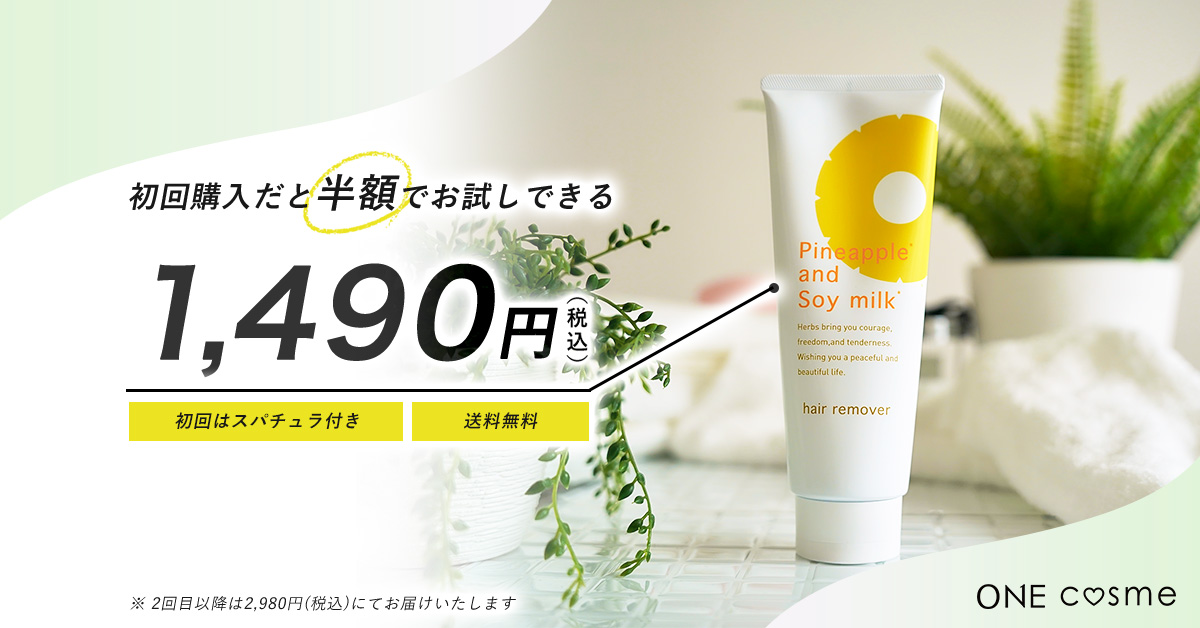 除毛だけでなく、除毛後の肌にも注目をし「肌への優しさ」を追求した除毛クリームです。除毛力満足度94.4%、美肌効果満足度95.3%を獲得しており、しっかりと除毛効果を実感しながら7つのハーブエキスと大豆エキスで肌を守れます。肌が弱い方でも安心して使えるのは嬉しいですね! パイナップル豆乳除毛クリームは、小さい子どものムダ毛ケアに悩んでいる方や肌を傷つけずに自宅で除毛できるクリームをお探しの方におすすめです。 ムダ毛の根本的な解決をしたい方などにはおすすめできません。 定価はスパチュラ付きで2,980円(税込)。定期コースの登録をすれば、3点以上のご購入で「まとめ割特別価格」や「ステージ割引」が適用され、よりお買い得価格で購入できます。 現在、公式サイトでは初めてご注文の方限定で、スパチュラ付き2,980円(税込)が半額の1,490円(税込)で送料無料キャンペーンを実施中! 初めて試してみたい方も半額で2,000以下なら購入しやすい価格ですね。 この機会にぜひお試しください!