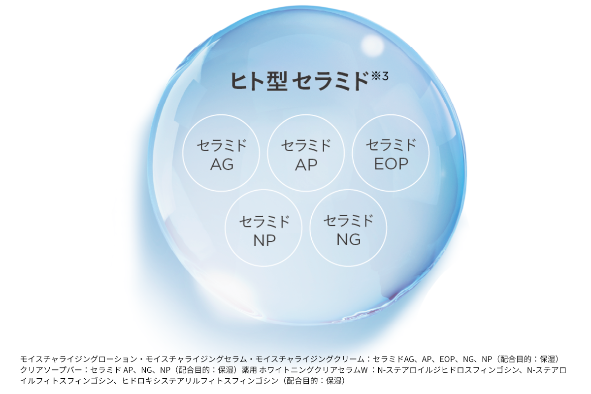 また、薬用 ホワイトニングクリアセラムWには、美白※7有効成分に加えてヒト型セラミド※8を配合。保湿と美白※7を同時に取り入れられる2in1設計で、乾燥によるくすみが気になる方にも嬉しい内容です。