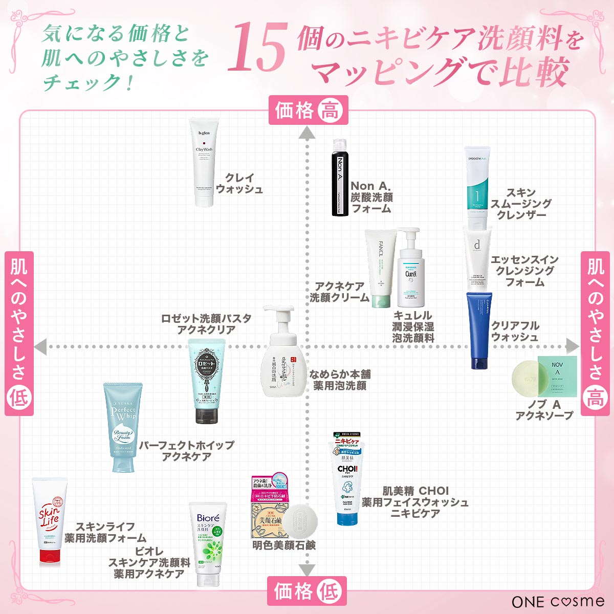 ニキビケア洗顔を使った方がいいことは分かったけど、どの商品を使えばいいか分からない…という方のために、今回ONEcosme編集部は、人気があるニキビケア洗顔料15種類を調査しました。