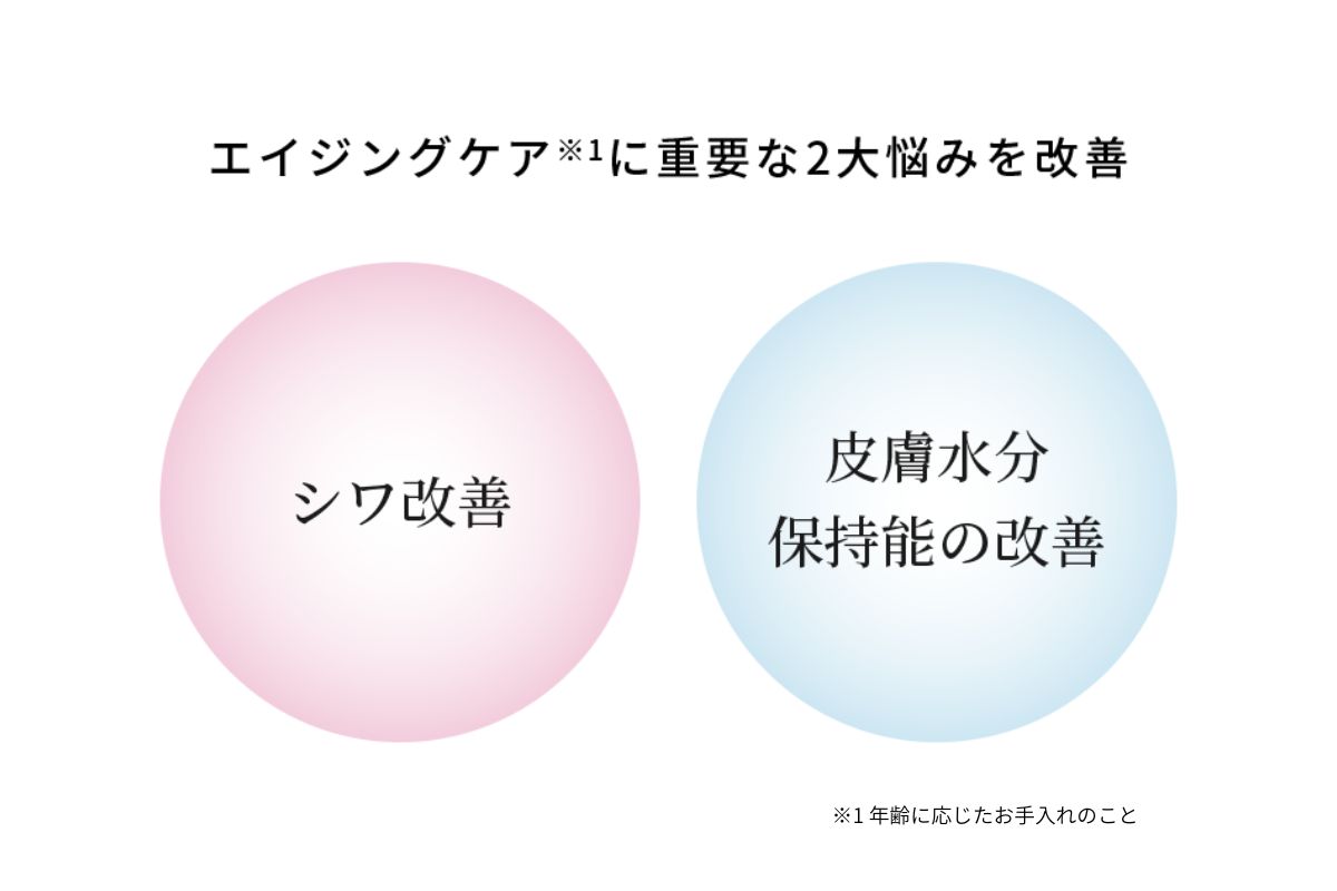 一般的に化粧水は、10〜20代の肌に合わせた処方がされているため、保湿・毛穴・ニキビ対策には特化しているものの、小ジワやくすみ、たるみなどの年齢肌の悩みの改善は期待できません。小シワやくすみ、たるみケアをしたいなら、プラスαで美容液を使うのがマスト。これからはよりエイジングに効果的なワンステップ上のスキンケアに切り替えるタイミングです。