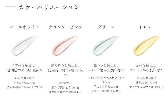 ピンク、グリーン、ブルー、パープル、イエロー、オレンジの6色のカラーがあり、血色感や、色ムラ、赤みなどそれぞれ肌悩みに合わせてカラーをチョイスしましょう。クリームタイプやリキッドタイプなど質感もさまざまなので、肌タイプに合わせて使い分けができるところも使いやすさのポイントです♪