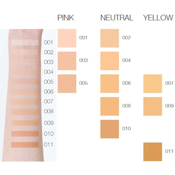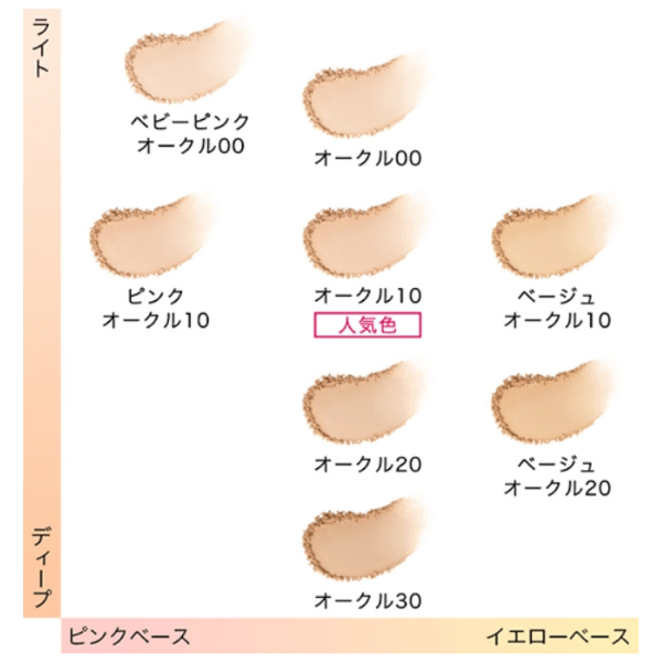 カラーは、黄みがかった日本人の肌色にも合わせやすい13色展開です。肌の明るさとイエローベース・ピンクベースの色味によってカラーチャートが設定されており、それぞれのパーソナルカラーに合うものが選べます。